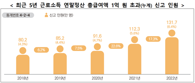 2021~2022년 사이 1억 초과 연봉자는 40만1000명이나 늘어났다.