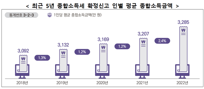 1인당 평균 종합소득금액은 3285만원으로 5년 전(3092만원)보다 193만 원(6.2%) 증가했다.