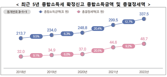 (조세금융신문=고승주 기자) 지난해 종합소득금액은 337.5조원으로 5년 전보다 종합소득금액은 57.9%(123.8조원) 늘어난 것으로 나타났다.