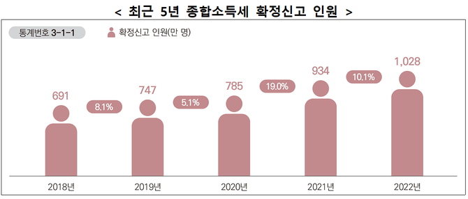 연도별 종합소득세 확정신고 인원은 2018년 691만명에서 2019년 747만명, 2020년 785만명, 2021년 934만명, 2022년 1028만명으로 늘어났다.