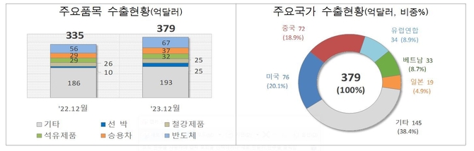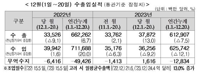 조업일수를 고려한 일평균 수출액은 22년 12월 21.6억에 비해 24.4억달러로 13%증가했다. 이 기간 조업일수는 15.5일로 지난해와 같았다.