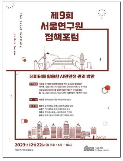 (조세금융신문=최주현 기자) 서울연구원은 이달 22일 오후 2시 서울연구원 대회의실에서 데이터를 활용한 시민안전 관리 방안을 주제로 제9회 정책포럼을 연다고 21일 밝혔다.