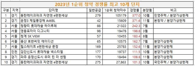 아울러 올해 상위 10개 단지 가운데 1위와 2위를 포함한 7개가 분양가 상한제 적용 단지였다. 1위는 지난 10월 분양된 '동탄레이크파크 자연앤 e편한세상'(민영주택)으로 일반공급 279가구에 10만5천179명이 몰리며 377.0대 1의 경쟁률을 기록했다. 같은 단지의 국민주택은 101.3대 1로 10위였다.