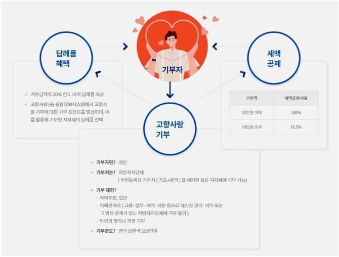 고향사랑기부제는 개인이 태어난 지역은 물론 학업·근무·여행 등을 통해 관계를 맺은 '제2의 고향' 등에 기부하면, 지자체는 기부금을 주민 복리증진 등에 사용하고 기부자에게는 세액공제와 답례품 혜택을 주는 제도다.