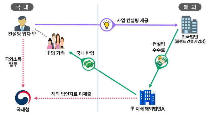 신고 누락한 컨설팅 수입은 甲이 설립한 해외 페이퍼컴퍼니 A에 은닉한 후 가족 명의 차명계좌로 국내 반입했다.
