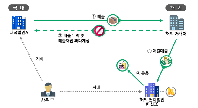 수출대금을 해외 현지법인 명의로 수령하고 내국법인 A의 해외 매출을 신고 누락하거나 매출채권 미회수로 변칙처리했다.