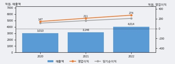 최근 실적을 살펴보면 2022년 매출액이 최근 3년 중 가장 높은 실적을 기록했음을 알 수 있다. 이전 최고 실적이었던 2021년 보다도 27.6%(868억 3천만원) 늘어난 것으로 나타났다.