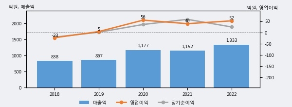 최근 실적을 살펴보면 2022년 매출액이 최근 5년 중 가장 높은 실적을 기록했음을 알 수 있다. 이전 최고 실적이었던 2020년 보다도 13.3%(156억 2천만원) 늘어난 것으로 나타났다.