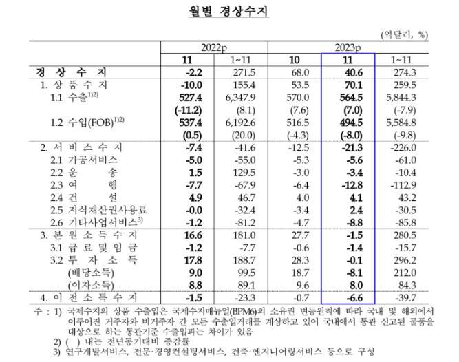 11월 경상수지를 항목별로 나눠보면, 상품수지(70억1천만달러)가 4월 이후 8개월 연속 흑자를 이어갔다. 10월(53억5천만달러)과 비교해 흑자 폭도 더 커졌다.
