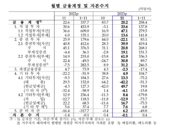 금융계정 순자산(자산-부채)은 11월 중 20억2천만달러 불었다. 직접투자의 경우 내국인의 해외투자가 2차전지 업종을 중심으로 47억1천만달러 증가했고, 외국인의 국내 투자도 13억6천만달러 늘었다.