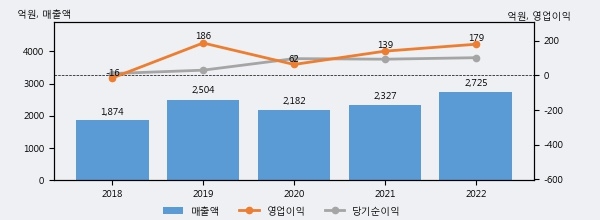 최근 실적을 살펴보면 2022년 매출액이 최근 5년 중 가장 높은 실적을 기록했음을 알 수 있다. 이전 최고 실적이었던 2019년 보다도 8.8%(220억 8천만원) 늘어난 것으로 나타났다.