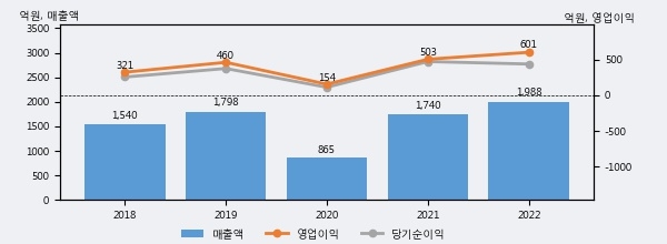 최근 실적을 살펴보면 2022년 매출액이 최근 5년 중 가장 높은 실적을 기록했음을 알 수 있다. 이전 최고 실적이었던 2019년 보다도 10.6%(189억 9천만원) 늘어난 것으로 나타났다.