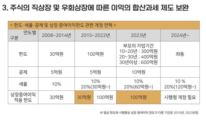 구체적으로 당초 증여가 있었던 때의 규정 적용(100억원 한도, 5억원 공제 30억원이하 10%, 30억원초과 20%세율)로 볼 것인지 아니면 상장에 따른 증여이익이 발생한 2024년 개정 법령을 따를 것인지(300/400/600억원 한도, 10억원 공제 120억원 이하 10%, 120억원 초과 20%세율)로 볼 것인지 의견이 엇갈리는 것.