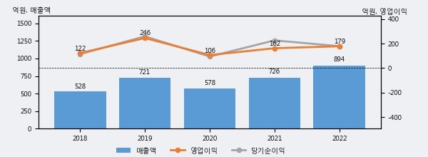 최근 실적을 살펴보면 2022년 매출액이 최근 5년 중 가장 높은 실적을 기록했음을 알 수 있다. 이전 최고 실적이었던 2021년 보다도 23.2%(168억 3천만원) 늘어난 것으로 나타났다.