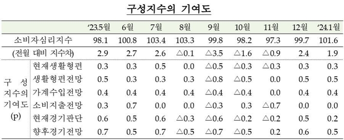 1월 소비자심리지수(CCSI)는 101.6으로 전월보다 1.9p 상승했다. 이 지수가 100선을 웃돈 것은 지난해 8월(103.3) 이후 5개월 만이다.