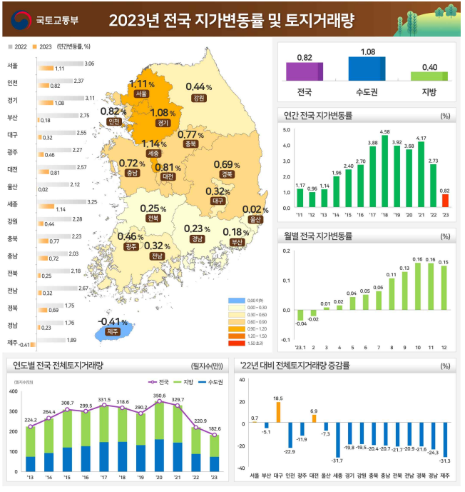 지난해 연간 지가변동률을 지역별로 보면 수도권(3.03%→1.08%) 및 지방(2.24%→0.40%) 모두 2022년 연간 변동률 대비 낮았다.