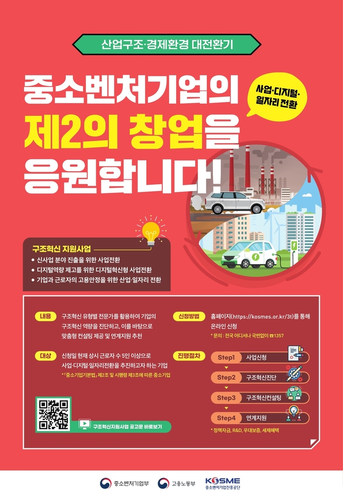 (조세금융신문=최주현 기자) 중소벤처기업진흥공단은 25일 기업 경쟁력을 확보할 수 있는 신사업 분야로의 구조 전환을 지원하기 위해 '2024년 구조혁신지원사업'에 참여할 기업을 오는 30일부터 모집한다고 밝혔다.