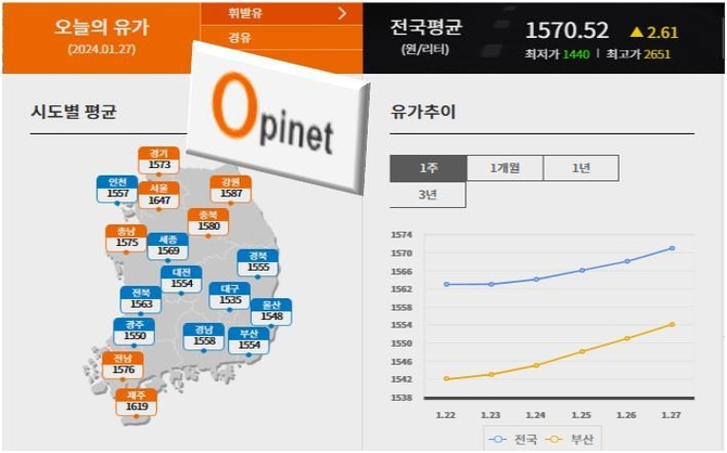 27일 한국석유공사 유가정보시스템 오피넷에 따르면 1월 넷째 주(21∼25일) 전국 주유소 휘발유 평균 판매가는 직전 주보다 L당 0.5원 하락한 1천563.7원이었다.