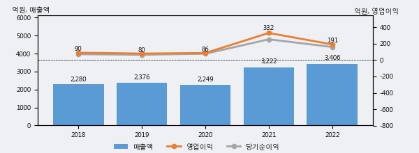 최근 실적을 살펴보면 2022년 매출액이 최근 5년 중 가장 높은 실적을 기록했음을 알 수 있다. 이전 최고 실적이었던 2021년 보다도 5.7%(184억 2천만원) 늘어난 것으로 나타났다.