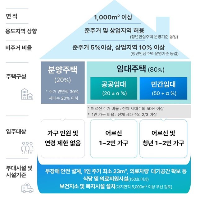 먼저 '65세 이상 무주택 노인 1인 또는 부부가구'를 위주로 민간과 공공 유형으로 나눠 공급하고, 저렴한 주거비와 고령자 맞춤 주거환경을 제공한다.