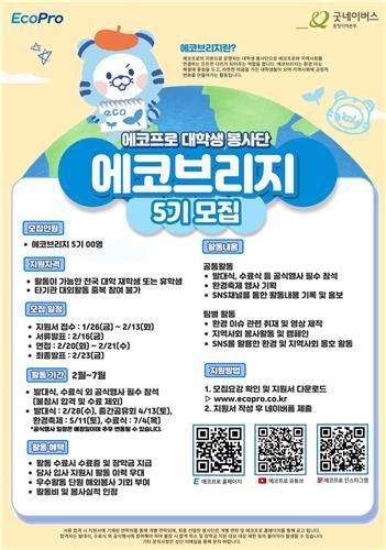 (조세금융신문=송기현 기자) 에코프로는 초록우산어린이재단과 함께 운영하는 대학생 봉사단 에코브리지 5기를 모집한다고 31일 밝혔다.