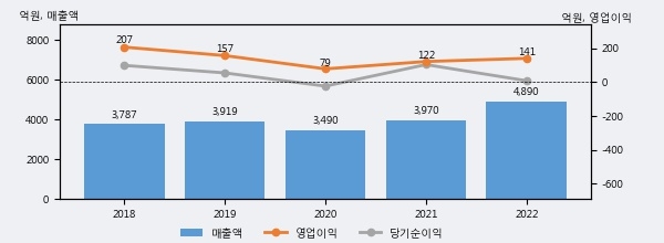 최근 실적을 살펴보면 2022년 매출액이 최근 5년 중 가장 높은 실적을 기록했음을 알 수 있다. 이전 최고 실적이었던 2021년 보다도 23.2%(919억 9천만원) 늘어난 것으로 나타났다.