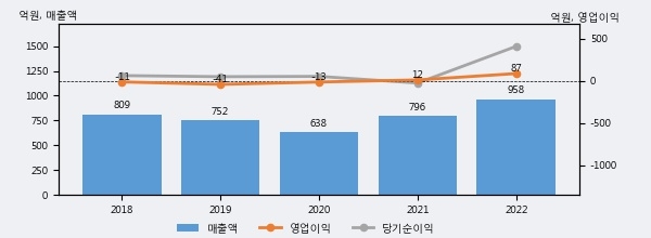 최근 실적을 살펴보면 2022년 매출액이 최근 5년 중 가장 높은 실적을 기록했음을 알 수 있다. 이전 최고 실적이었던 2018년 보다도 18.4%(148억 9천만원) 늘어난 것으로 나타났다.