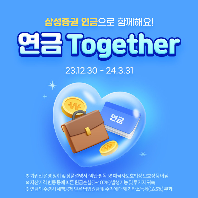 (조세금융신문=김종태 기자) 삼성증권이 연금저축, 개인형 퇴직연금(IRP) 계좌에 입금하는 고객을 대상으로 '연금 투게더' 이벤트를 다음 달 말까지 진행한다.