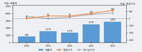 최근 실적을 살펴보면 2022년 매출액이 최근 5년 중 가장 높은 실적을 기록했음을 알 수 있다. 이전 최고 실적이었던 2021년 보다도 13.2%(333억 1천만원) 늘어난 것으로 나타났다.