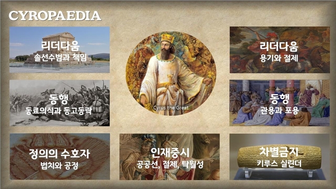 ‘역사에서 배우는 리더십’은 페르시아 키루스 대왕(부하와 성과를 나눔), 춘추시대 초나라 장왕(부하의 잘못을 포용), 캐터필러 CEO 제임스데 스페인(직원으로부터 신뢰를 받음)에 대해 영상시청을 했다.