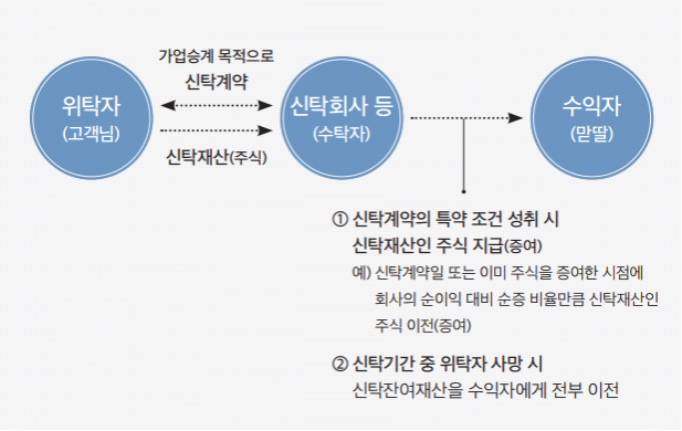 따라서 한꺼번에 주식을 물려주는 것이 아니라 신탁을 통해 신탁기간 전체에 걸쳐서 증여 조건 성취 시(예를 들면 기업의 매출액이 이전보다 5% 이상씩 증가할 때마다 신탁재산인 주식의 일부를 수익자에게 이전·증여) 후계자이자 신탁계약의 수익자인 딸에게 주식을 단계적으로 물려주는 것이 효과적일 수 있습니다. 신탁을 활용하면 고객님이 기억하지 않아도 신탁회사 등 수탁자가 매년 또는 정기적으로 조건 등을 파악 및 검토하여 주식 소유권을 맏딸에게 이전할 수 있습니다.