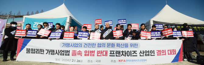 한국프랜차이즈산업협회(이하 협회·회장 정현식)는 26일 오전 서울 여의도 국회의사당 앞에서 '불합리한 가맹사업법 개정 졸속입법 반대 프랜차이즈 산업인 결의 대회'를 개최, 야당의 일방적인 본회의 상정 방침을 강력히 비난하고 차기 국회에서 신중하게 재논의할 것을 촉구했다.