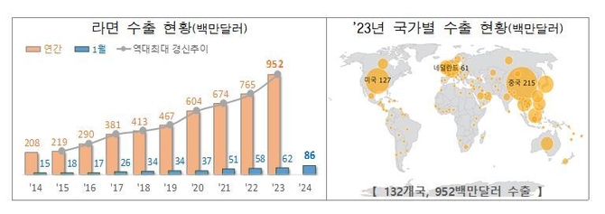 관세청에 따르면 라면은 2023년 수출액 및 물량(24.4만톤)모두 코로나 이후 최근 4년내 약 2배 증가한 역대 최대 규모다. 이는 봉지라면 120g으로 약 20억개에 이르며 승용차 5만대 이상을 수출한 것과 같은 규모다.