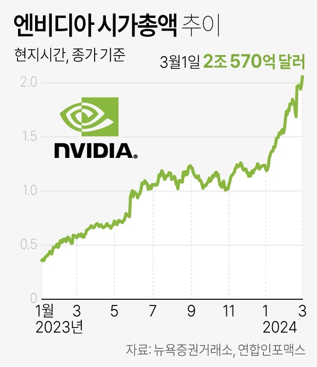 그 영향으로 AI 반도체 기업들의 주가가 동반 상승하며 엔비디아 시가총액이 처음으로 종가 기준 2조달러(약 2천672조원)를 넘어섰다.