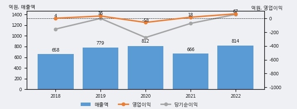 최근 실적을 살펴보면 2022년 매출액이 최근 5년 중 가장 높은 실적을 기록했음을 알 수 있다. 이전 최고 실적이었던 2020년 보다도 0.2%(1억 6천만원) 늘어난 것으로 나타났다.