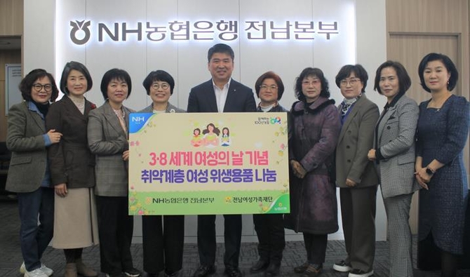(조세금융신문=송기현 기자) NH농협은행 전남본부(본부장 정재헌)는 세계 여성의 날 기념으로 전남여성가족재단에 여성 위생용품(300만원 상당)을 전달했다고 7일 밝혔다.