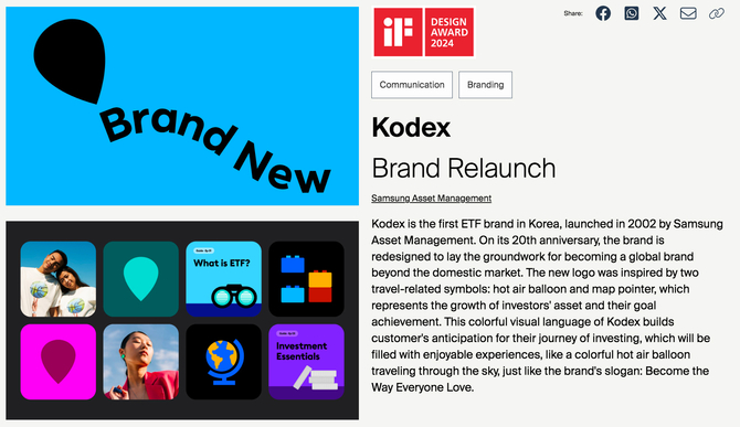 삼성자산운용은 리브랜딩 디자인 방향성을 반영해 작년 3월, KODEX 홈페이지를 재단장했는데, 이번 iF 디자인 어워드 수상은 리브랜딩 디자인 관련 4번째 상이다.