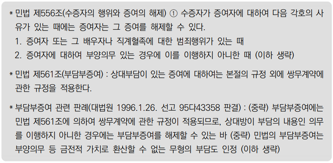 ‘해제조건부・부담부증여 계약과 증여신탁을 복합적으로 활용’한다면 고객님이 원하는 바를 해결할 수 있습니다. 해제조건부・부담부증여 계약이란 증여자인 고객님이 수증자인 딸에게 재산을 증여할 때 효도 및 부양의 조건 등을 붙이는 것을 말하고, 수증자인 딸이 그 조건을 성실히 이행하지 않을 때는 증여계약을 해제하여 다시 증여자인 고객님에게 재산을 반환하는 것을 말합니다(민법 제556조*, 제557조, 제561조*에 근거).
