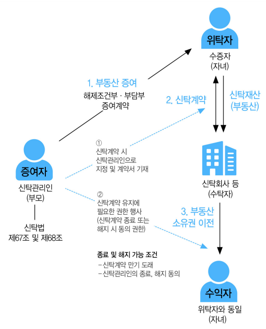 [ 해제조건부・부담부증여 계약과 증여신탁 구조도]