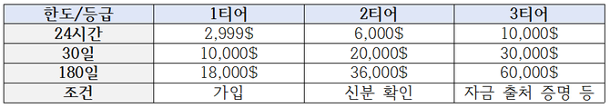 2티어가 되면 1일 한도 6,000$, 30일 한도 20,000$, 180일 한도 36,000$로 1티어 대비 2배가 오르게 된다. 가장 높은 등급인 3티어의 경우 자금 출처를 증명하는 등 2티어보다 더 많은 증명 자료를 요구한다. 3티어의 한도는 1일 10,000$, 30일 30,000$, 180일 60,000$로 1티어 기준 3배가 올라간다. 한도의 경우 국가마다 상이하지만 Remitly측에서 공식적으로 설정한 한도는 위 설명과 같다.