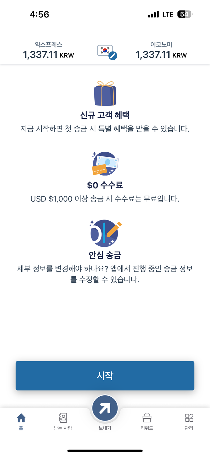 Remitly의 메인화면은 위와 같다. 우선 현재 환율을 최상단에 보여주고 있으며 익스프레스 환율과 이코노미 환율을 모두 보여주고 있다. 홈페이지와 마찬가지로 한글을 지원하고 있어 영어를 어려워하는 이용자들도 쉽게 이용할 수 있다. 또한 홈 화면 자체가 굉장히 심플하고 직관적이라 시각적으로도 부담스럽지 않고 모바일 뱅킹을 어려워하는 장년층들도 어렵지 않게 사용할 수 있다.
