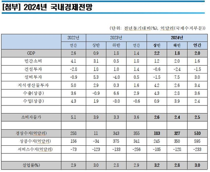 다만 고금리·고물가에 따른 실물경제 침체와 정책지원 여력 약화는 경기 회복에 부정적으로 작용할 수 있다며 민간 부채 리스크에 대한 원활한 대처 여부가 올해 성장 흐름을 좌우할 것이라고 강조했다.