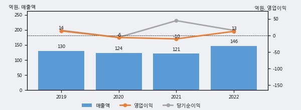최근 실적을 살펴보면 2022년 매출액이 최근 4년 중 가장 높은 실적을 기록했음을 알 수 있다. 이전 최고 실적이었던 2019년 보다도 12.1%(15억 7천만원) 늘어난 것으로 나타났다.