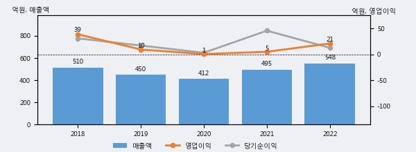 최근 실적을 살펴보면 2022년 매출액이 최근 5년 중 가장 높은 실적을 기록했음을 알 수 있다. 이전 최고 실적이었던 2018년 보다도 7.4%(37억 7천만원) 늘어난 것으로 나타났다.