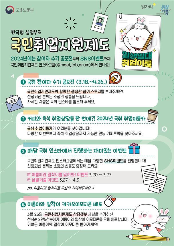 (조세금융신문=최주현 기자) 고용노동부는 18일부터 한 달간 국민취업지원제도 집중 홍보기간을 운영하고, 수기 공모전, 찾아가는 상담, 온라인 이벤트 등을 진행한다고 밝혔다.