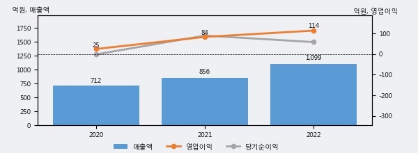 최근 실적을 살펴보면 2022년 매출액이 최근 3년 중 가장 높은 실적을 기록했음을 알 수 있다. 이전 최고 실적이었던 2021년 보다도 28.5%(243억 9천만원) 늘어난 것으로 나타났다.