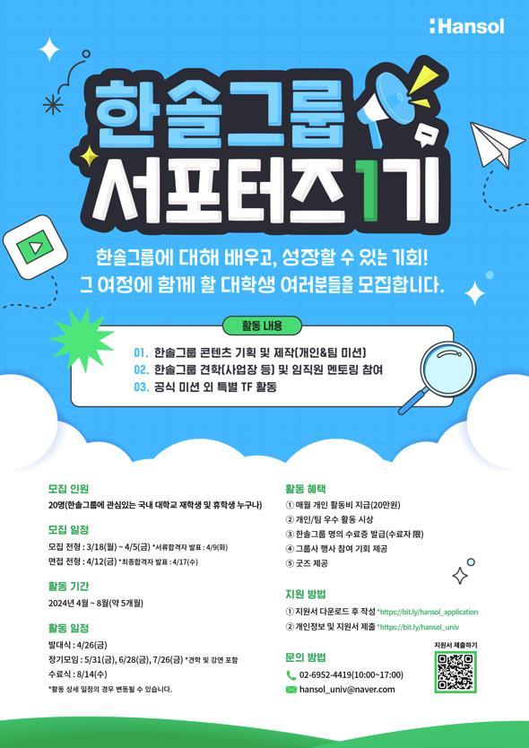 서류전형과 면접을 거쳐 20명을 선발하며, 이들은 약 5개월간 홍보대사로 활동하면서 한솔그룹 관련 콘텐츠 제작과 주요 계열사 사업장 방문 등의 활동을 할 예정이다.