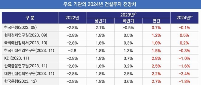 대한건설정책연구원을 비롯해 한국은행(-1.8%), 한국개발연구원(-1.0%), 한국금융연구원(-1.6%) 등 대부분의 기관은 올해 건설투자가 작년에 이어 마이너스를 기록할 것으로 보고 있다.