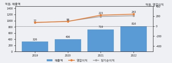 티앤엘의 2022년 매출액은 전년대비 13.5% 늘어난 816억원이고, 영업이익 또한 전년대비 8.9% 늘어난 243억원을 기록했다. 이 회사의 매출액 증감률과 영업이익 증감률은 각각 코스닥 상위 48%, 상위 48%에 해당된다.