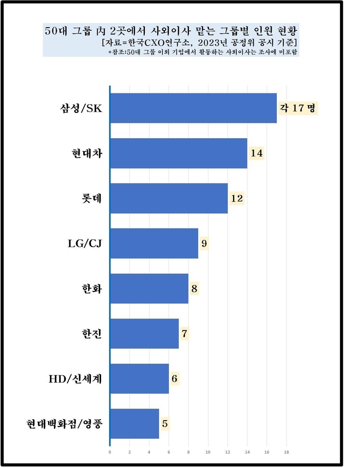 그룹별로는 삼성과 SK 사외이사 중 각각 17명이 2개 회사 사외이사를 겸하고 있다. 현대차는 14명, 롯데는 12명, LG·CJ는 각 9명이 이 같은 사례에 해당하는 것으로 나타났다.